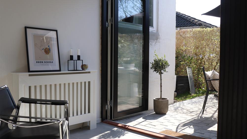 "Vi var i tvivl om, hvilken løsning vi skulle bruge til udgangen til vores lille terrasse. Den eksisterende dør fungerede fint, men vi ville gerne have en løsning, hvor vi kunne udvide indearealet med uderummet. Vi kontaktede Vinduesgrossisten, som meget kyndigt og venligt hjalp os med forslag til hvordan det nye parti kunne se ud.