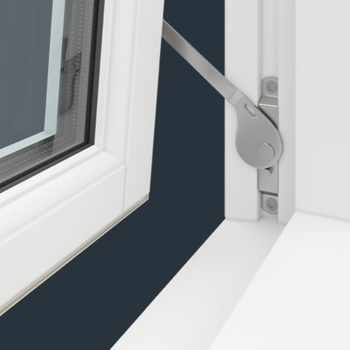 Sådan virker sikringen: 1. Vinduet åbnes, indtil sikkerhedsarmen går i indgreb. 2. Vinduet lukkes igen ca. 2 cm. 3. Sikkerhedsarmen hægtes af krogen, mens du åbner vinduet. 4. Når vinduet er lukket, vil sikkerhedsarmen automatisk gå i indgreb igen, næste gang vinduet åbnes.