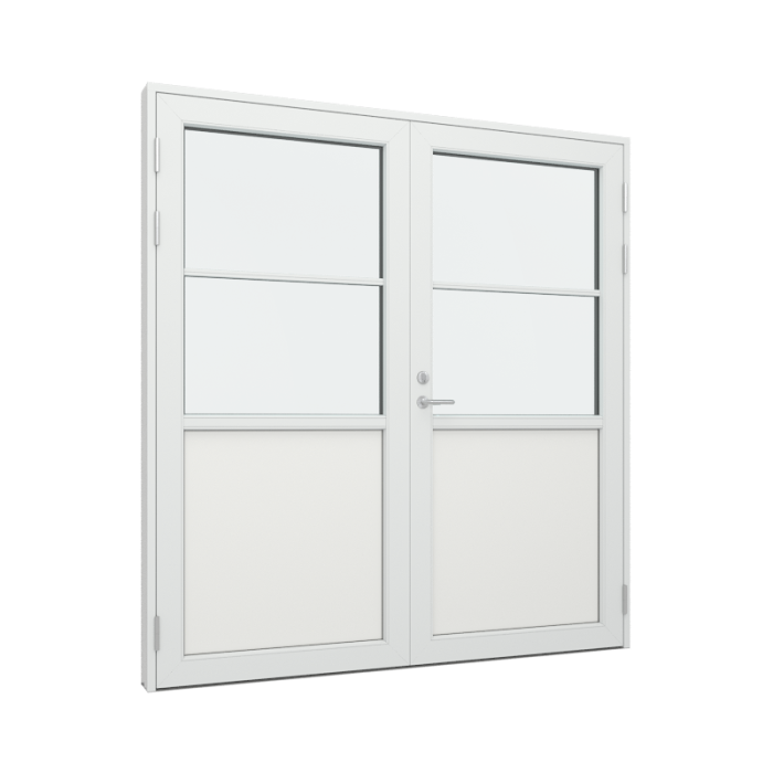 Bemærk ved indadgående dobbeltdøre Når du skal vælge åbningsretning på din dobbeltdør, er det af stor vigtighed at kontrollere, om døren kan risikere at blive udsat for slagregn og blæst uden læ forhold. Konstruktionsmæssigt kan dobbelt indadgående døre nemlig ikke sikres 100 % mod vandindtrængning ved vejrforhold som eksempelvis slagregn. For at sikre optimal lukketæthed skal 3-punktslåsen være aktiveret og vi anbefaler altid udadgående døre hvis døren ikke er i læ. Der ydes således ikke garanti mod vandindtrængning på baggrund af ovenstående forhold. Det er normalt at Branchen tages forbehold for dette, vi har valgt at gøre dette forbehold mere synlig, så de som kan vælge udadgående døre, også vælger udadgående døre, inden de køber døren.
