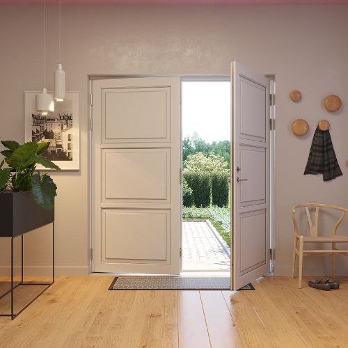 Bemærk ved indadgående dobbeltdøre Når du skal vælge åbningsretning på din dobbeltdør, er det af stor vigtighed at kontrollere, om døren kan risikere at blive udsat for slagregn og blæst uden læ forhold. Konstruktionsmæssigt kan dobbelt indadgående døre nemlig ikke sikres 100 % mod vandindtrængning ved vejrforhold som eksempelvis slagregn. For at sikre optimal lukketæthed skal 3-punktslåsen være aktiveret og vi anbefaler altid udadgående døre hvis døren ikke er i læ. Der ydes således ikke garanti mod vandindtrængning på baggrund af ovenstående forhold. Det er normalt at Branchen tages forbehold for dette, vi har valgt at gøre dette forbehold mere synlig, så de som kan vælge udadgående døre, også vælger udadgående døre, inden de køber døren.
